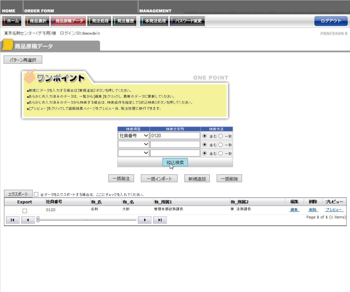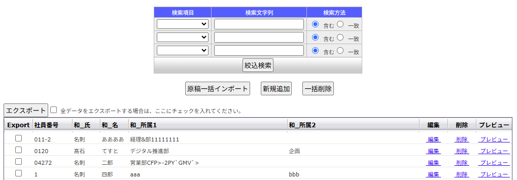 社員の名刺データをひとつひとつ入力して登録・変更する必要はありません。 初回登録もcsvで一括登録ができ、人事異動や名刺情報が大きく変わる際にも、現在登録されているデータをエクスポート、そのデータを修正し、インポートすることで、一括変更が可能です。